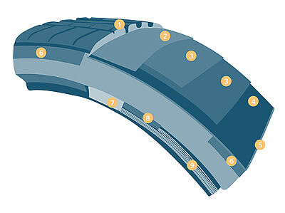 Por término medio, un neumático de coche moderno contiene hasta 25 componentes y 12 compuestos de caucho diferentes. Estos componentes son