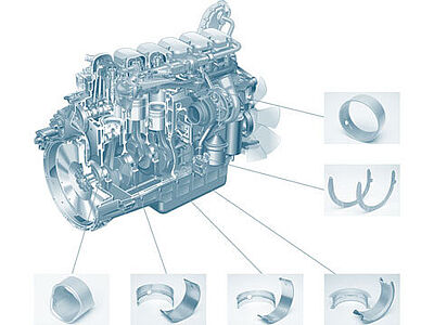 Los cojinetes lisos tienen la misión de soportar y guiar los componentes móviles dentro del motor y, sobre todo, permitirles girar casi sin desgaste. Se utilizan, por ejemplo, en la biela y en los siguientes ejes giratorios: