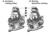 B: En la posición de conducción dinámica, la válvula (2) está cerrada, permitiendo que se mueva la sección hidráulica (4). El resultado es un recorrido de la suspensión (1) de respuesta dinámica dura. Las ventajas de los soportes de motor conmutables electrónicamente: