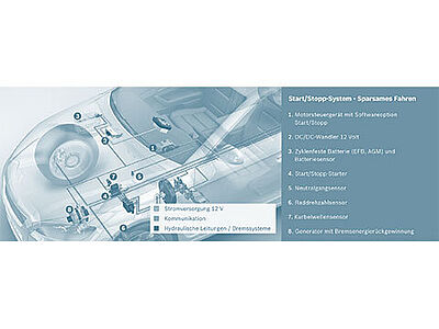 Los sistemas de arranque-parada también imponen mayores requisitos de carga a las baterías de los vehículos. Además de un mayor rendimiento, deben tener una mayor estabilidad de ciclo en comparación con las baterías de arranque convencionales. Deben suministrar la energía necesaria para los frecuentes arranques del motor y para los consumidores eléctricos del vehículo durante la fase de parada. Estos requisitos los cumplen las baterías con tecnología EFB (baterías húmedas optimizadas) o AGM (baterías no tejidas). Las baterías AGM se utilizan en sistemas con recuperación de energía (frenado regenerativo).